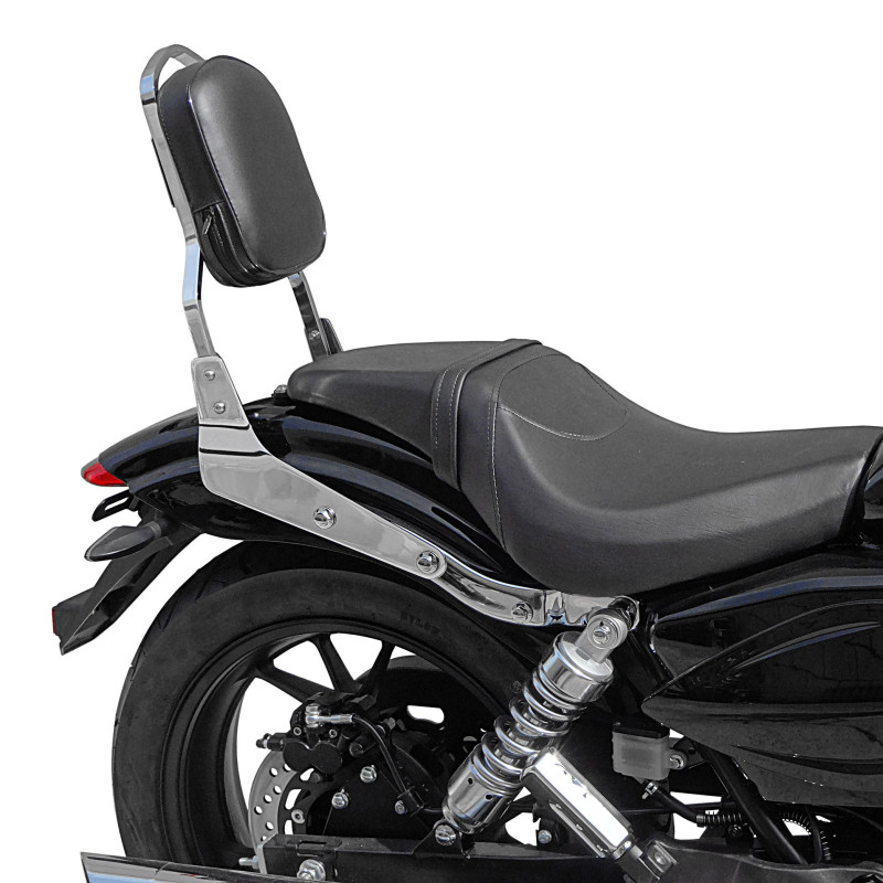 Verwandeln Sie Ihr Motorrad, indem Sie Komfort und Funktionalität mit dieser robusten und eleganten Sissy Bar kombinieren. Seine solide Stahlkonstruktion garantiert große Stabilität, während seine gepolsterte Rückenlehne dem Passagier optimalen Halt bietet. Mit einem Sky-Cover (Kunstleder) überzogen, vereint es Ästhetik und Haltbarkeit und widersteht gleichzeitig schlechtem Wetter und Feuchtigkeit.